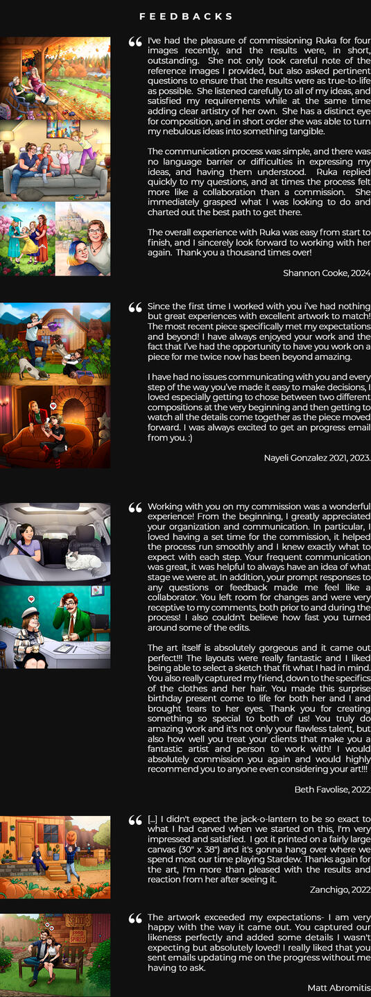 Callie commissioned me to illustrate a fun moment! Something cozy and happy. Firstly, I asked her some pictures of her family along with a small description of what they are like. After some back-and-forth ideas, I made some sketches for the poses and base colors. Once the sketches were approved, we moved on to lineart, colors and finally render.You can check out Callie's (and other's) review of my work in the tab Reviews.